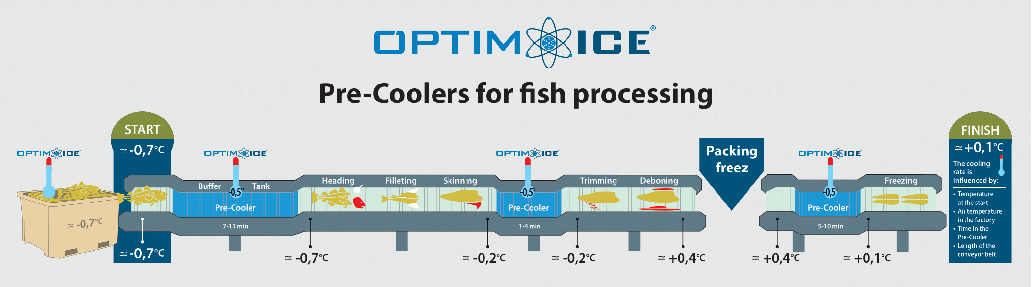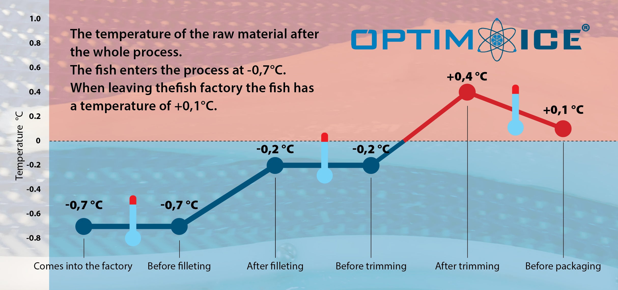 Frá því að fiskurinn er veiddur og hitastig hans er 6°C, tekur ekki meira en 1 klst að kæla fiskinn niður í -0,3°C til -0,9°C með því að nota OptimICE® ískrapakerfið og það helst við þetta hitastig í gegnum allt ferlið.