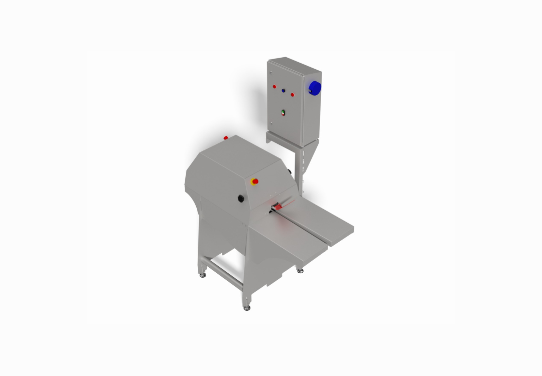 The frame cutting machine receives fish frames from the filleting machine and separates the swim bladder and blood part with a bone section from the frames. The swim bladder and the bone section is dropped down from underneath and from the end of the frame cutter either into a collection basket or onto a takeaway conveyor. After the swim bladder and bone sections are removed, the frames and belly flap bones are sent to the mincing machine, which delivers fish mince and skeletons separately.